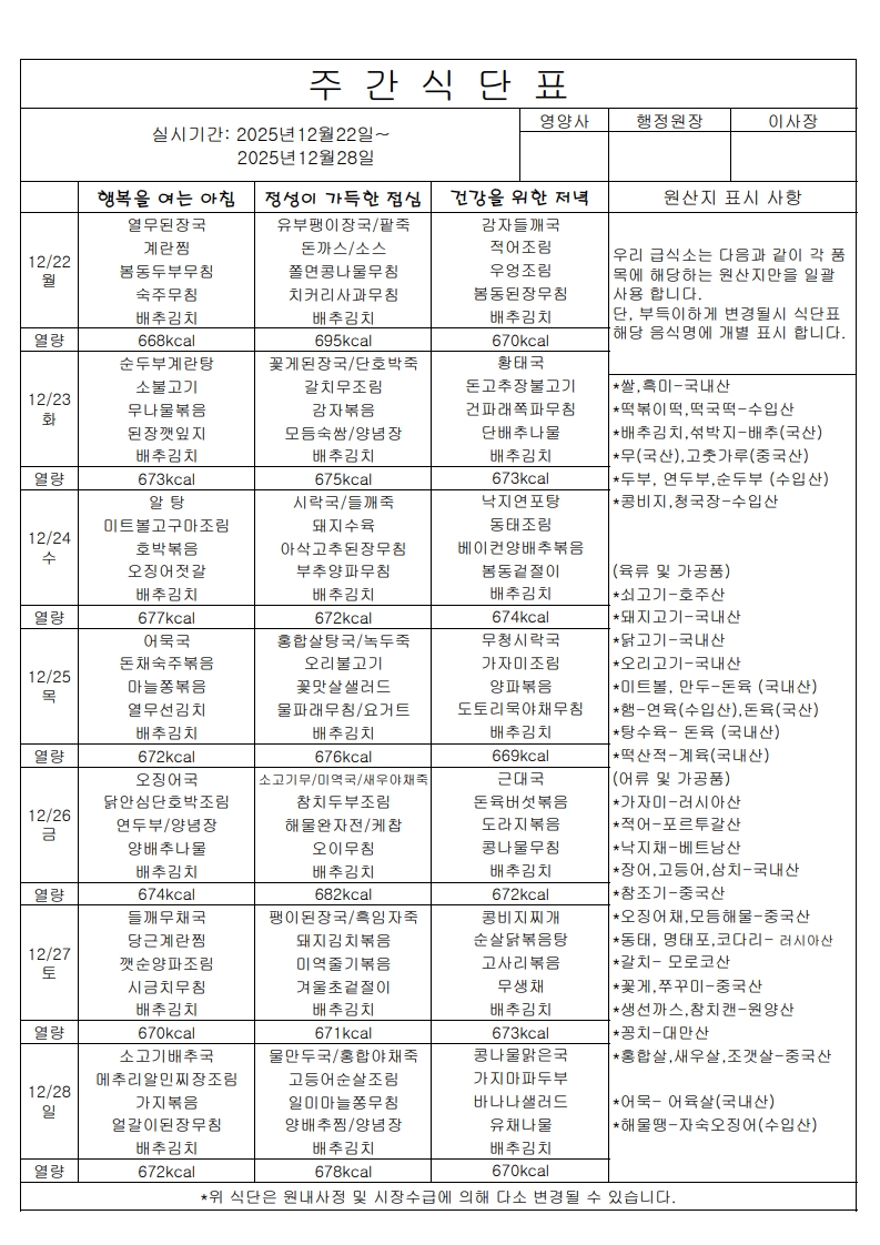 주간식단표(12.22 ~12.28)