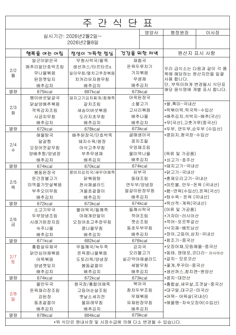 주간식단표(2.2~2.8)